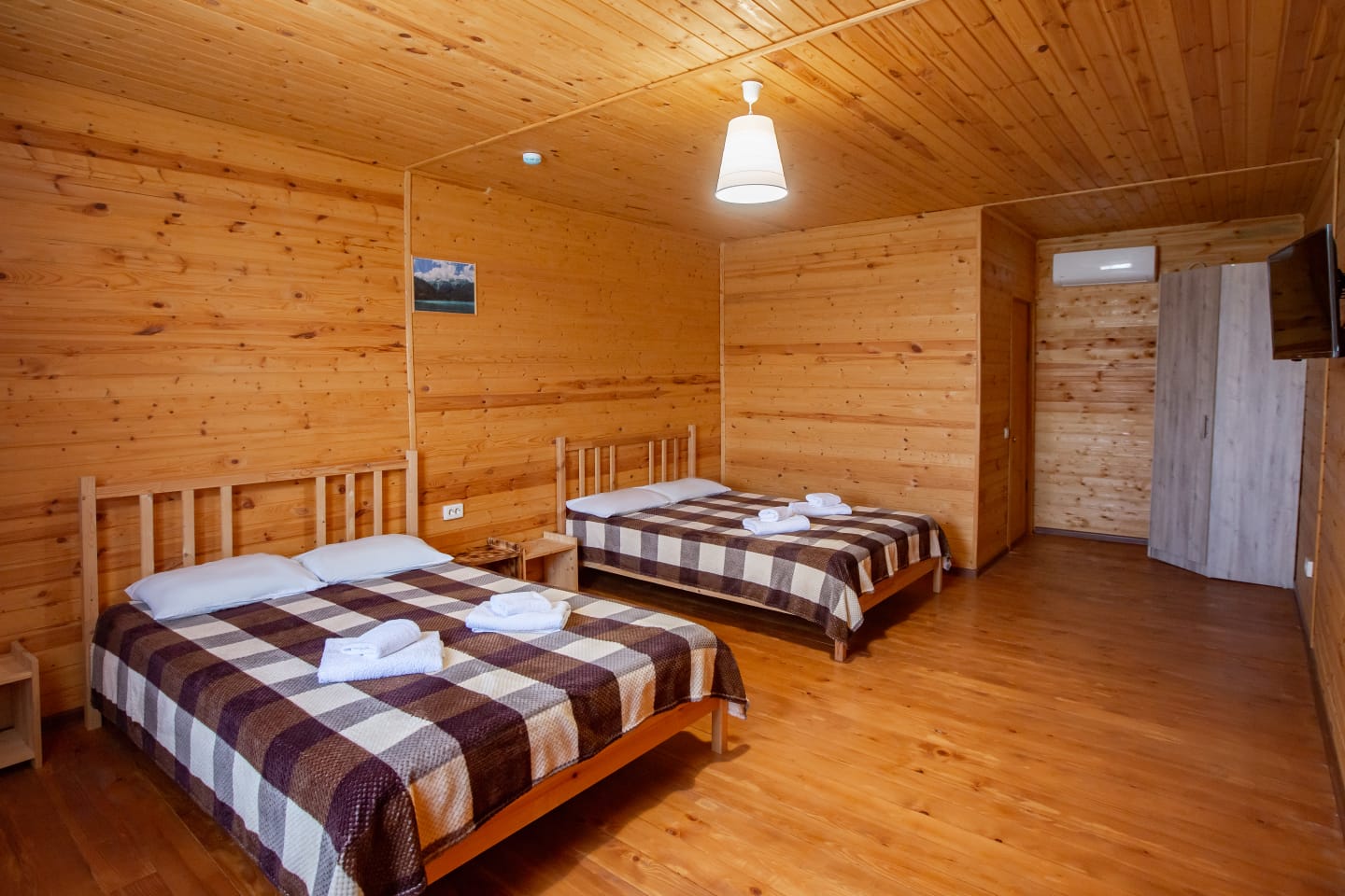 Гостей ожидают однокомнатные номер Стандарт, рассчитанные на двух-, трех- и четырехместное заселение. В номерах есть санузел с душем, телевизор, двуспальные кровати и открытая веранда. Мебель в комнатах выполнена и экологически чистых материалов. На первом этаже работает столовая, где гости могут заказать себе завтраки, обеды и ужины. На всей территории доступен беспородной интернет, для детей возле корпуса организована игровая площадка с качелями.