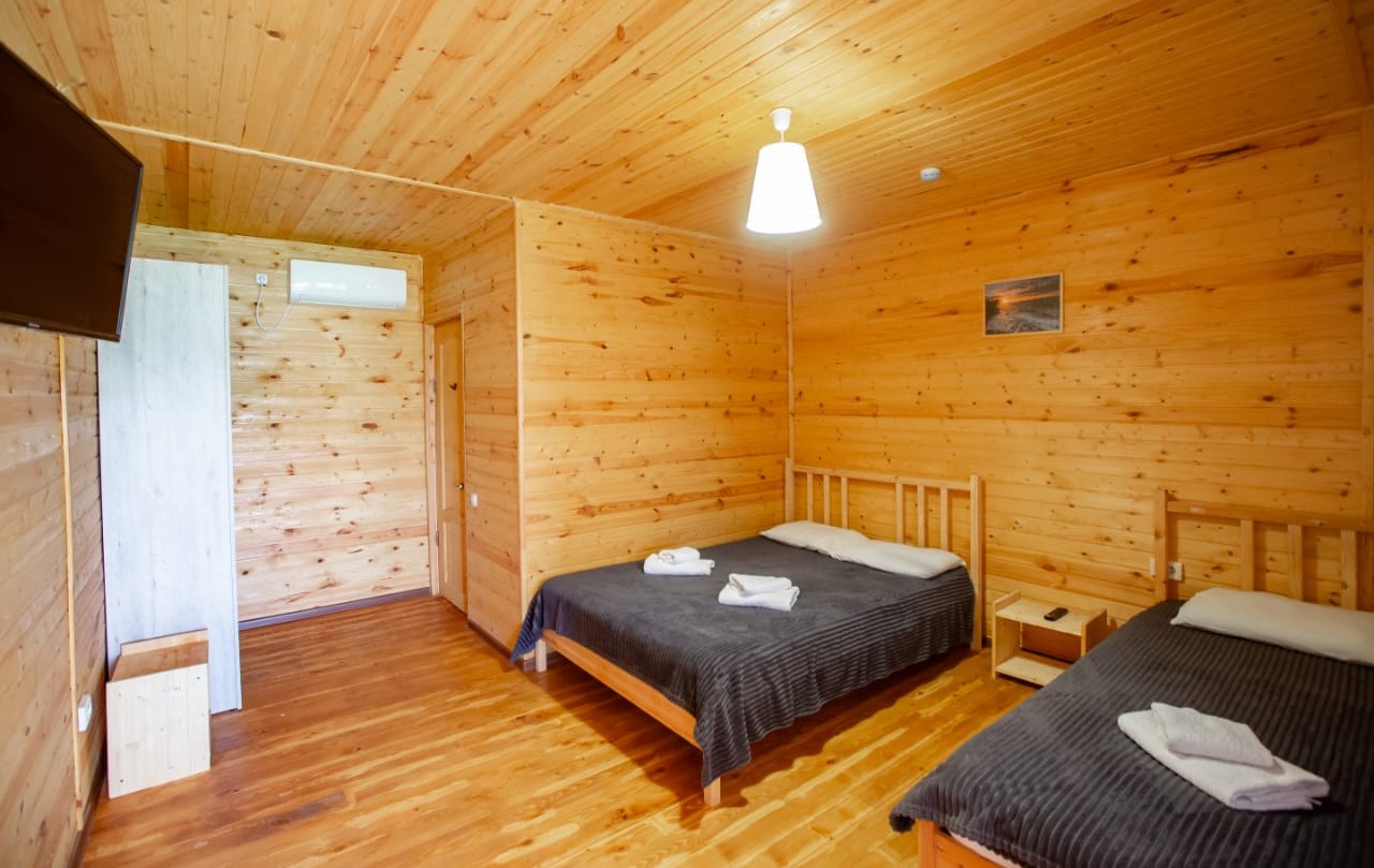 Площадь номера - 25 кв.м. 3 осн. места. 1 доп. место. Мебель: вешалка, зеркало, кровать двуспальная, кровать односпальная, прикроватные тумбочки, тумба, шкаф. Оборудование: кондиционер, телевизор. Санузел: с душем, туалетные принадлежности. Сервис: Wi-Fi бесплатно, смена полотенец, смена постельного белья, уборка номера.