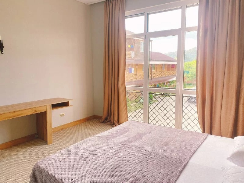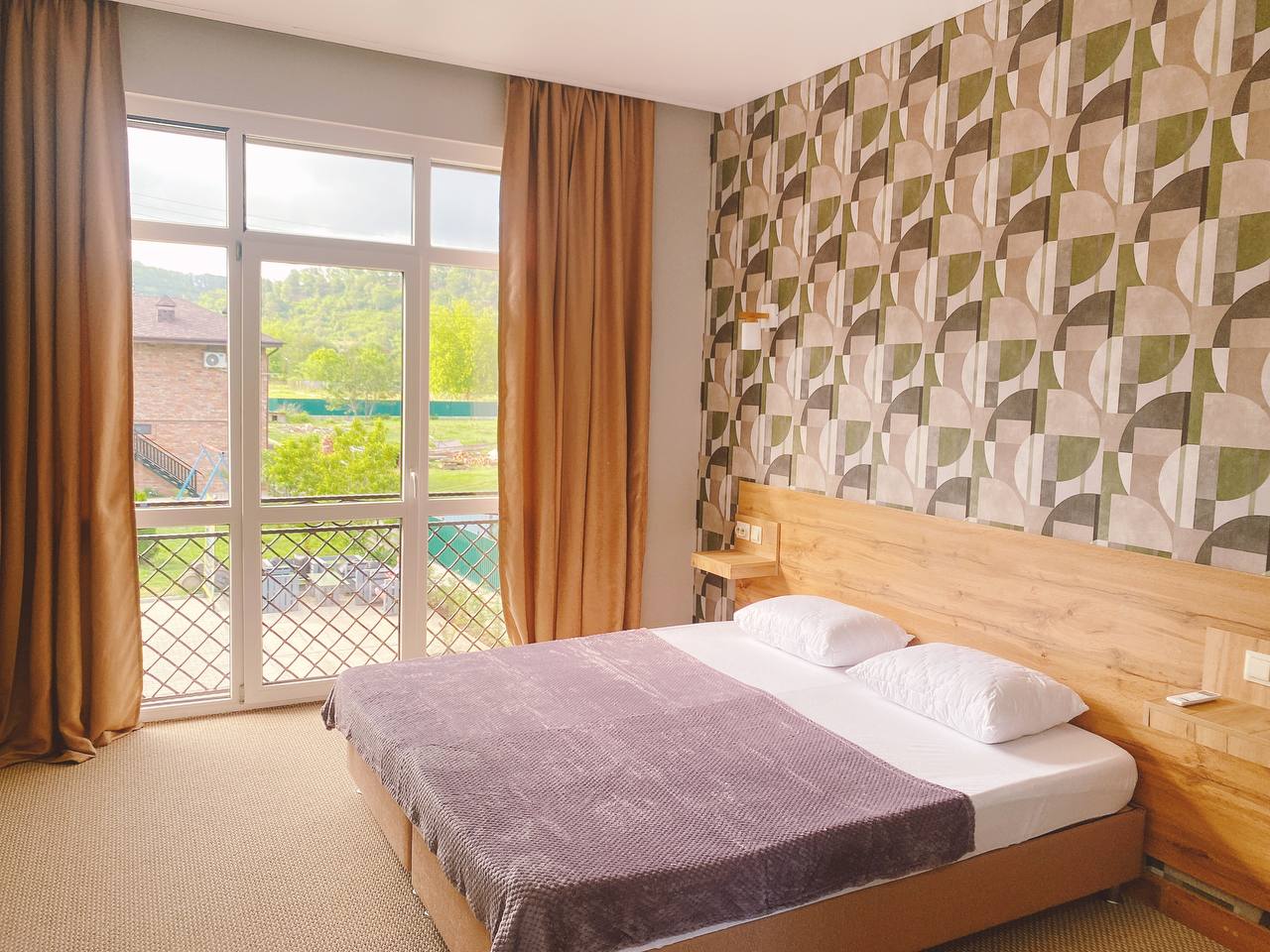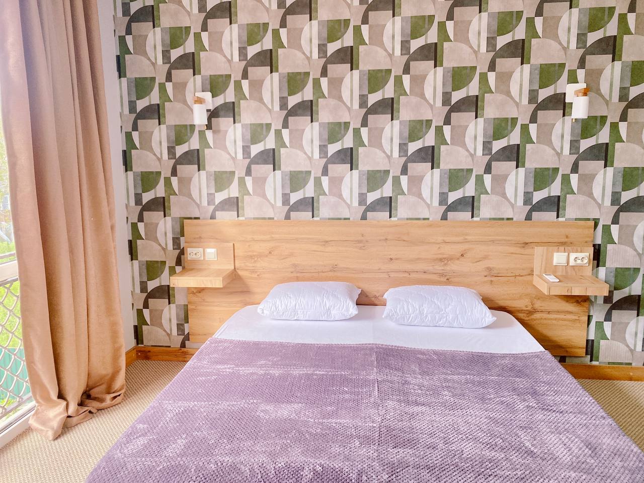 Площадь номера - 22 кв.м. 2 осн. места. Мебель: вешалка, зеркало, кровать двуспальная, прикроватные тумбочки, стол, шкаф. Оборудование: кондиционер, телевизор. Санузел: с душем, туалетные принадлежности. Сервис: Wi-Fi бесплатно, смена полотенец, смена постельного белья, уборка номера.